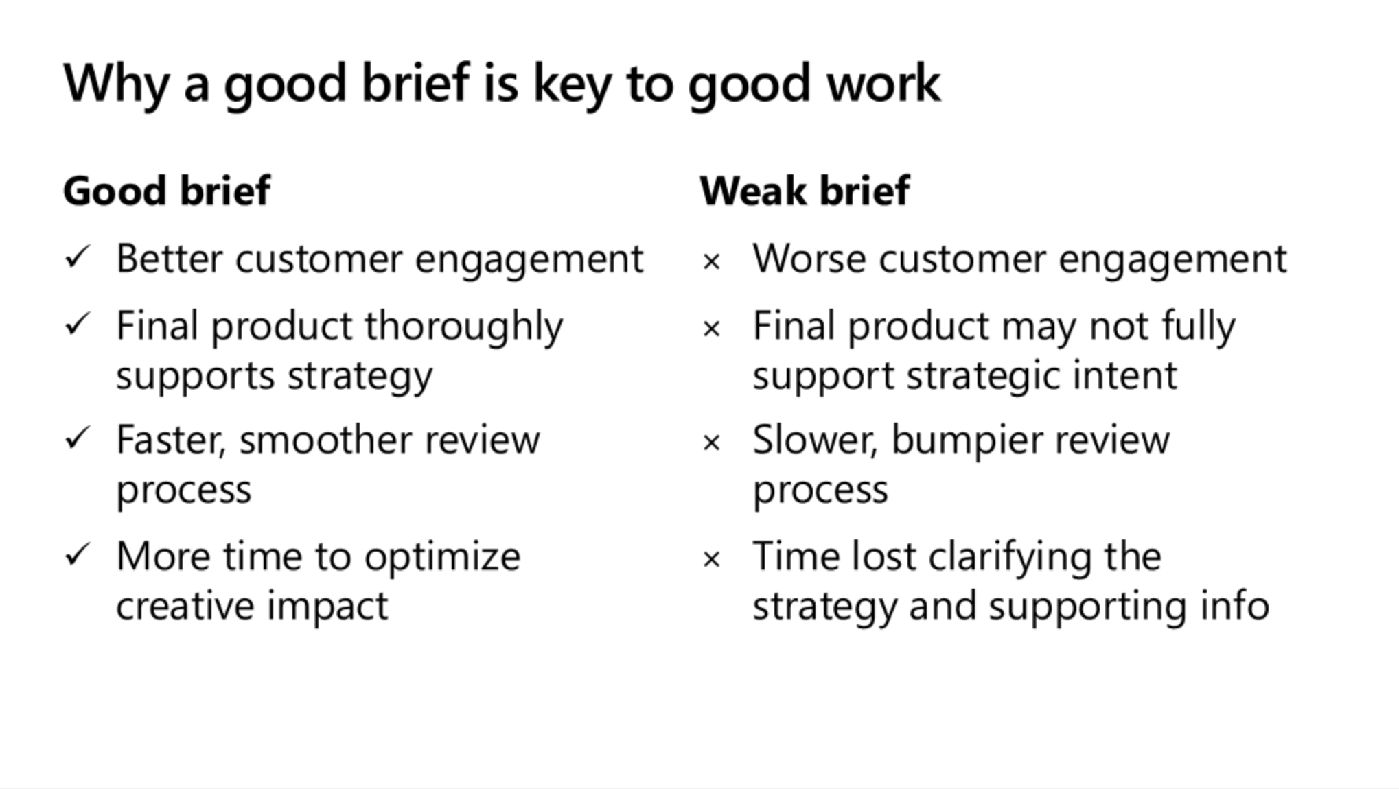 I’m also a champion for good creative briefs that articulate clear strategies and outcomes. Having been on the receiving side of creative briefs for so long, I conceived and developed an extensive “How to write great creative briefs” training program to teach content strategists how to get better creative results by writing better briefs.